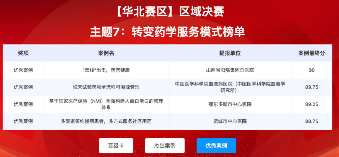 本次全国医院擂台赛在比赛主题、赛制、发掘和宣传上推陈出新,共征集到2995个案例,分五个赛区(东西北、华北、华东、中南、西南)进行,其中华北赛区600余个案例参赛。阳煤集团总医院积极组织临床、护理、门诊、药学、康复等专业学科,根据比赛主题进行案例申报,共精选出六个案例参赛。经过案例申报、网络投票、在线评审等环节,药学部的案例《“双线”出击,“药”您健康》入围华北赛区(主题七:转变药学服务模式)前十佳。10月14日,王树林、王维代表药学部参加华北赛区现场决赛,捧回“优秀案例”奖牌。