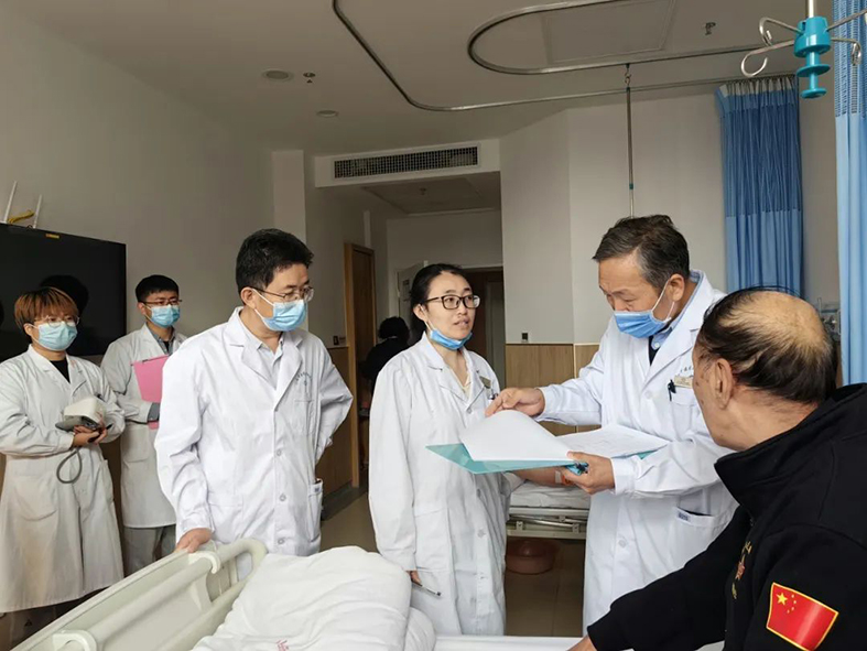 史大卓教授与来自医院心血管病中心、内分泌科、脑病科、肺病科、脾胃病科、肾病科、病案室、医务科的专家来到病房对患者望、闻、问、切,详细查体。一场“以患者为中心”的头脑风暴正式展开。西苑医院常驻山西医院心血管病专家段文慧、内分泌科专家邹本良对治疗方案提出自己的建议,其他专家们紧密围绕患者病情各抒己见。结合各位专家意见,史大卓教授和心血管病中心团队全面分析病情,从中西医结合角度出发,为患者研究出治疗的最优解。