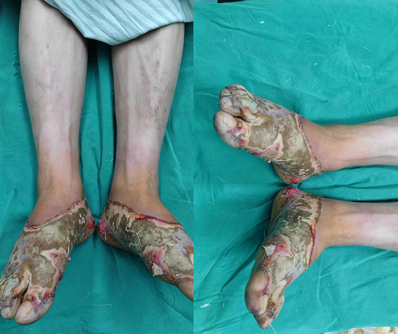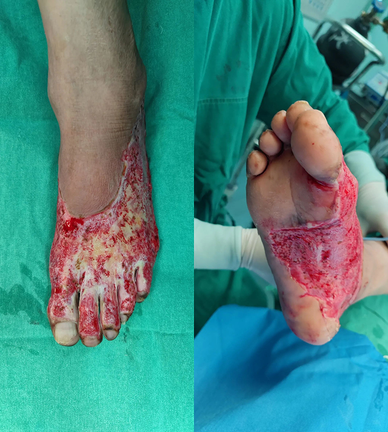 患者王某,男,53岁,双足被热水烫伤伴憋胀21小时余,就诊于长治市第二人民医院。入院检查:双足大部分表皮脱失,灰褐色痂皮覆盖,肿胀明显,累计烧伤面积约6%TBSA。入院7天后,烧伤整形科吴爱斌主任、王泽朋医生为其行双足烧伤创面扩创削痂植皮+右大腿取皮术。术中,采用滚轴去皮刀削切创面坏死痂皮,气动取皮刀削取皮片,进行皮片移植。术后2周,患者烫伤部位恢复如初,顺利出院。