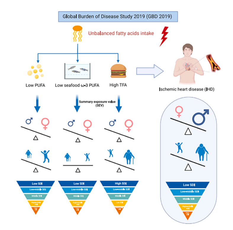 该研究利用2019年全球疾病负担研究的数据,分析了总暴露值(SEV)的趋势和不平衡脂肪酸摄入的归因负担,包括1990年至2019年饮食中低多不饱和脂肪酸(低PUFAs)、低海鲜omega-3脂肪酸(低海鲜-(ω-3)-PUFAs)和高反式脂肪酸(高TFA)的饮食。不平衡的脂肪酸摄入与一系列健康结果有关,然而在全球范围内,对人类健康的影响仍不清楚。该研究发现整体脂肪酸摄取量远未达到最佳水平。高收入的北美地区高TFA饮食的SEV最高,而位于撒哈拉以南非洲的欠发达地区低PUFAs和低海鲜-(ω-3)-PUFAs饮食的SEV最高。可归因的负担不平等地分配给较不发达区域。男性的SEV较低,但可归因于的负担高于女性,这种性别差距在59岁之前尤为明显。年轻人群低PUFAs饮食的SEV较高,低海鲜-(ω-3)-PUFAs饮食的SEV相当,但高TFA饮食的SEV低于年老者。