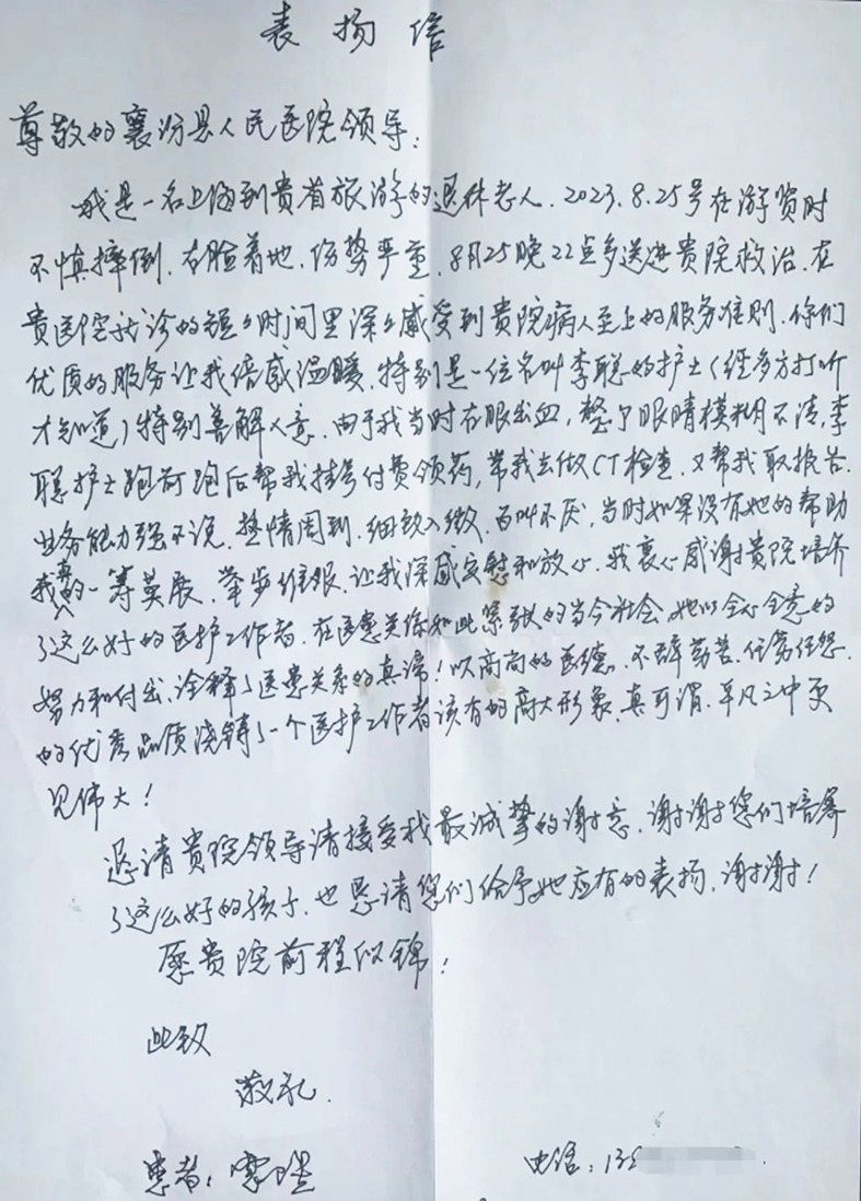 事情还要从2023年8月25日说起,一名上海籍退休老人在来晋旅游时不慎摔倒,右脸着地,伤势严重,送到襄汾县人民医院急诊科救治。由于没有家属,接诊医生立即开通绿色通道,开具CT检查,急诊科护士跑前跑后帮其挂号、付费、领药......优质的服务让患者倍感温暖,深深感受到该院“病人至上”的服务准则。
