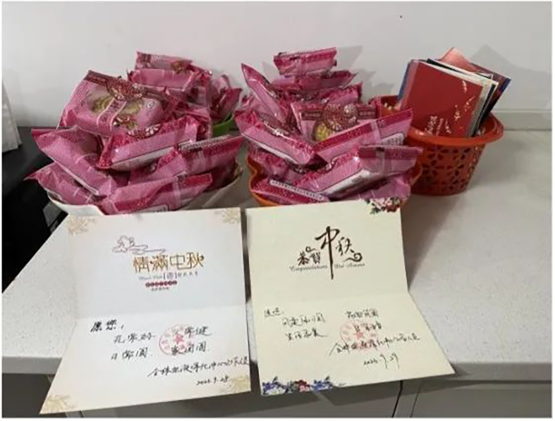 “中秋明月与我同辉,皎如云霞光溢辉。”中秋节一早,血液净化中心全体医护人员为每一位血透病友送上精心准备的代表美好与团圆的中秋月饼和祝福贺卡。伴随着一声声“中秋快乐、早日康复”的真挚祝福,血液透析室里充满了欢声笑语,场面温馨。医护人员还为患者发放了小国旗,带领大家挥舞着国旗一同唱响《我和我的祖国》,将活动推向高潮。