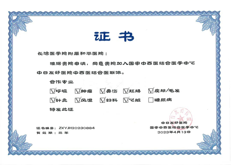 近日,山西省医院协会副会长单位——长治医学院附属和平医院正式成为国家中西医结合医学中心——中日友好医院中西医结合医联体成员单位,将在呼吸、肿瘤、骨伤、皮肤等9个专业领域展开深度交流协作。