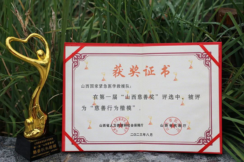 8月25日,第一届“山西慈善奖”颁奖仪式在太原举行。山西国家紧急医学救援队荣膺第一届“山西慈善奖”——慈善行为楷模殊荣。山西国家紧急医学救援队副队长张旭升代表救援队领奖,并接受省委书记蓝佛安会见。