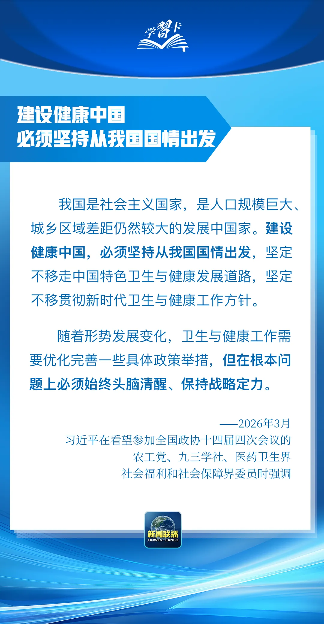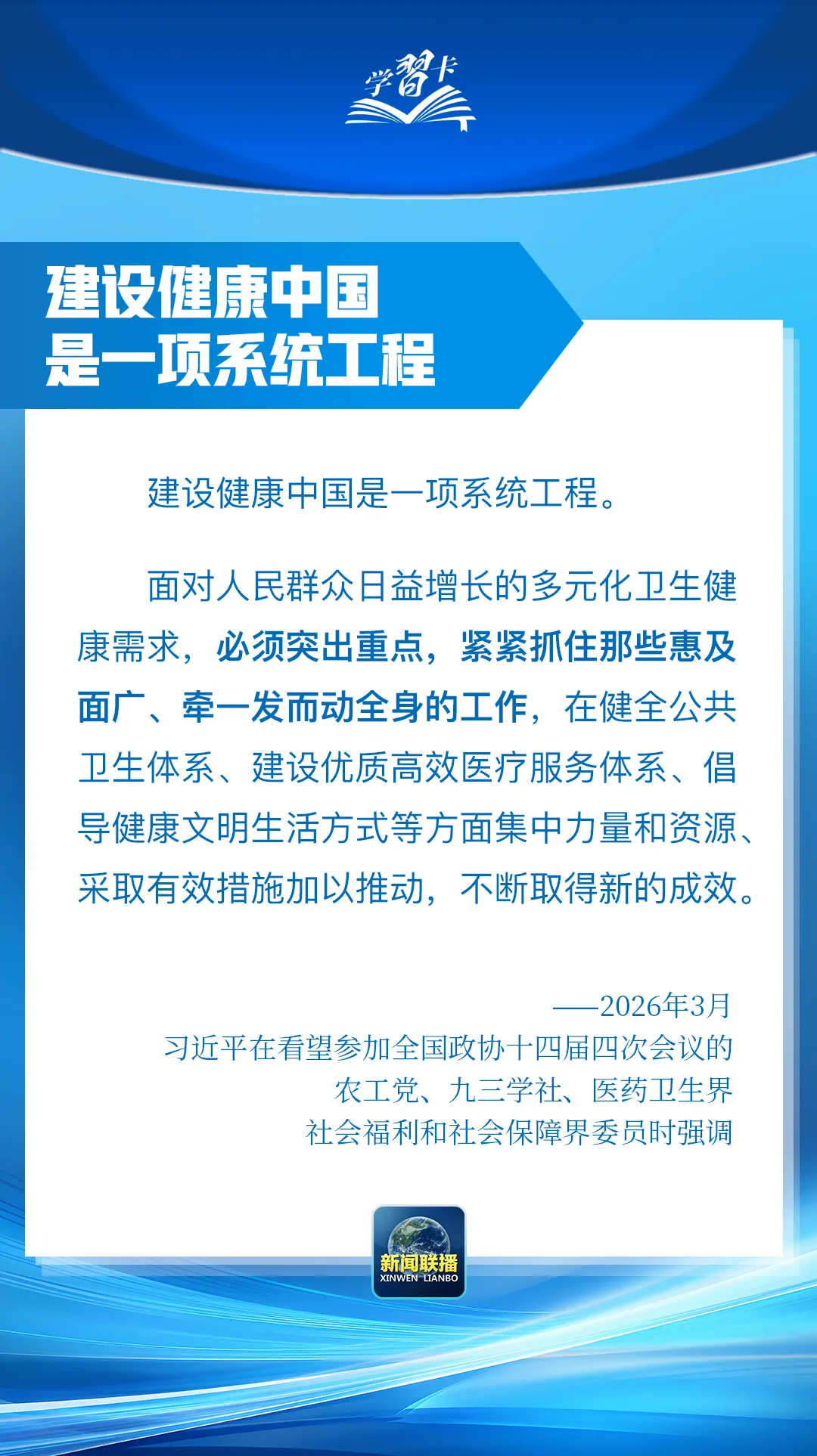 总书记在重要讲话中强调,坚定不移走中国特色卫生与健康发展道路,推动“十五五”时期健康中国建设取得决定性进展。