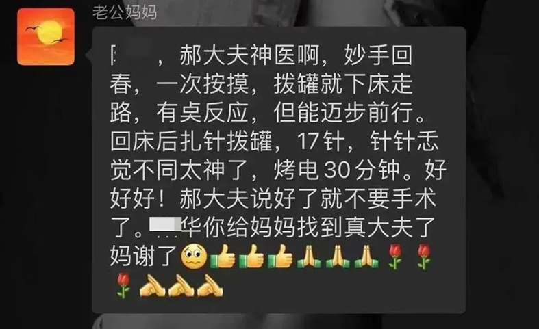 为老人进行完治疗已经夜深了,回到家的郝国君打开手机看到患者家属发来的聊天截图,被疼痛折磨多日的马大娘对家人描述了治疗效果,并连说三个“好”字!那个入院时焦虑的老人仿佛变了一个人。看到患者树起了战胜疾病的信心,郝国君由衷地感到欣慰,感觉自己浑身充满了力量,工作一天的疲惫也消失殆尽。