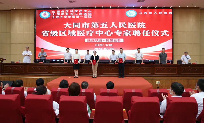 7月3日,山西省人民医院、大同市第五人民医院省级区域医疗中心专(学)科共建合作协议签约仪式暨重点专(学)科引进专家聘任仪式在大同举行。山西省医院协会副会长单位——山西省人民医院院长李荣山、副院长孙化中,大同市副市长高新文、大同市委组织部副部长郑天杰、大同市卫健委主任纪青、大同市发改委副主任李存育,山西省医院协会常务理事单位——大同市第五人民医院党委书记尉杰忠、院长张晋华等出席会议。