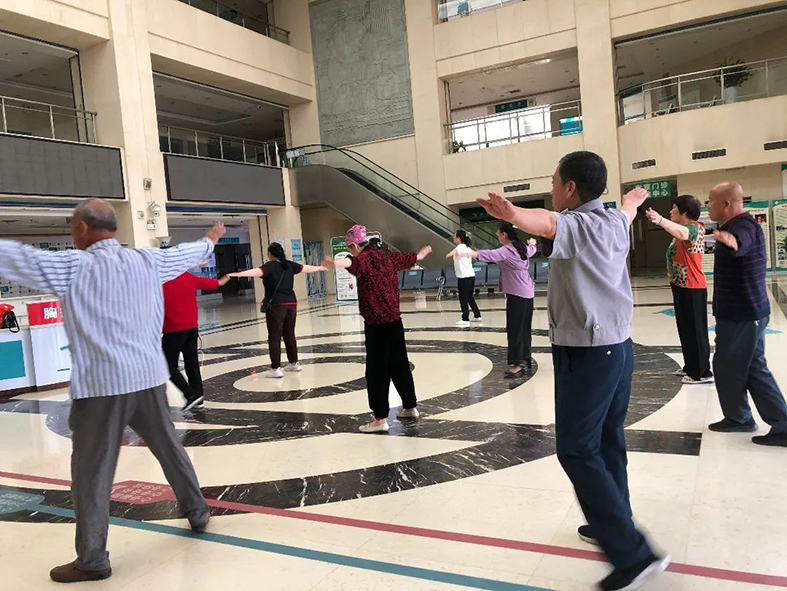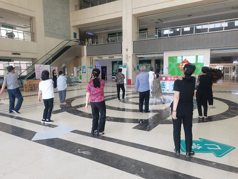 今年4月,在护理部号召下,中医康复科医护团队以中医理论为基础,结合穴位分布、经络走向,自创了一套中医拍打养生操。经过音频录制、人员组织、场地选择等一系列前期准备,5月23日,医患在花园里开始习练中医拍打养生操。遇到天气状况不好时,中医康复科便将练习场地转移到医院门诊大厅内,保证大家每天练习不间断。十余天来,在全院临床科室大力支持和广泛宣传下,越来越多的患者和家属投入到锻炼中,不少医务人员下班后也参与进来,每当音乐结束时,总有一些人意犹未尽,迟迟不愿离开。