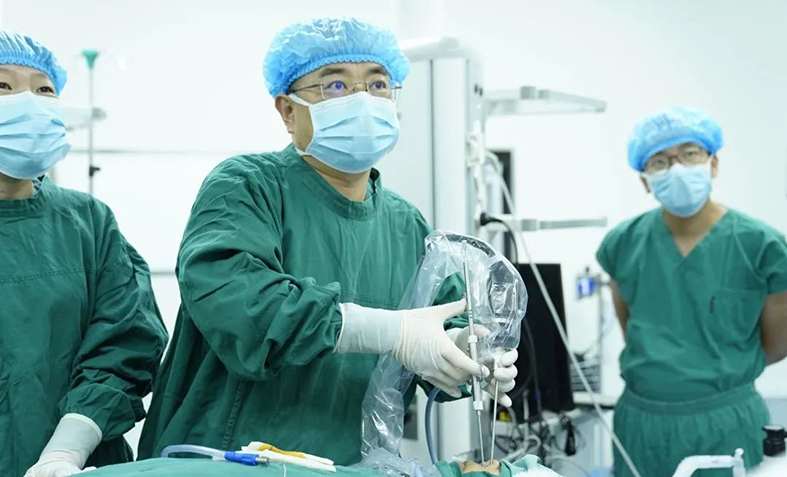 经综合研判并取得患者及家属同意后,詹红星团队决定采用内镜下左侧咽鼓管球囊扩张术进行治疗。这是目前最先进的咽鼓管功能障碍微创治疗技术——用一根极细的咽鼓管专用球囊,在鼻内镜直视下精准地找到咽鼓管咽口,置入咽鼓管球囊扩张系统,之后用加压泵加压,将咽鼓管阻塞部位(软骨部)充分扩张,从而一次性解决丁大叔咽鼓管功能障碍问题。