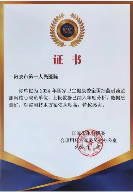近日,山西省医院协会常务理事单位——阳泉市第一人民医院检验科收到国家卫生健康委合理用药专家委员会办公室颁发的荣誉证书。这份证书对阳泉市第一人民医院2024年度细菌耐药监测工作给予高度评价,明确指出阳泉市第一人民医院作为2024年国家卫生健康委全国细菌耐药监测网核心成员单位,上报数据已纳入年度分析,数据质量好,对监测技术方案依从度高。