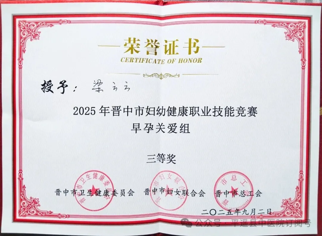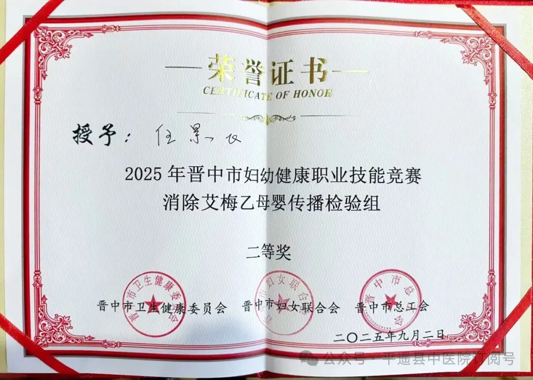 近日,山西省医院协会理事单位——平遥县中医院在2025年晋中市妇幼健康职业技能竞赛上,夺得一个二等奖、一个三等奖。