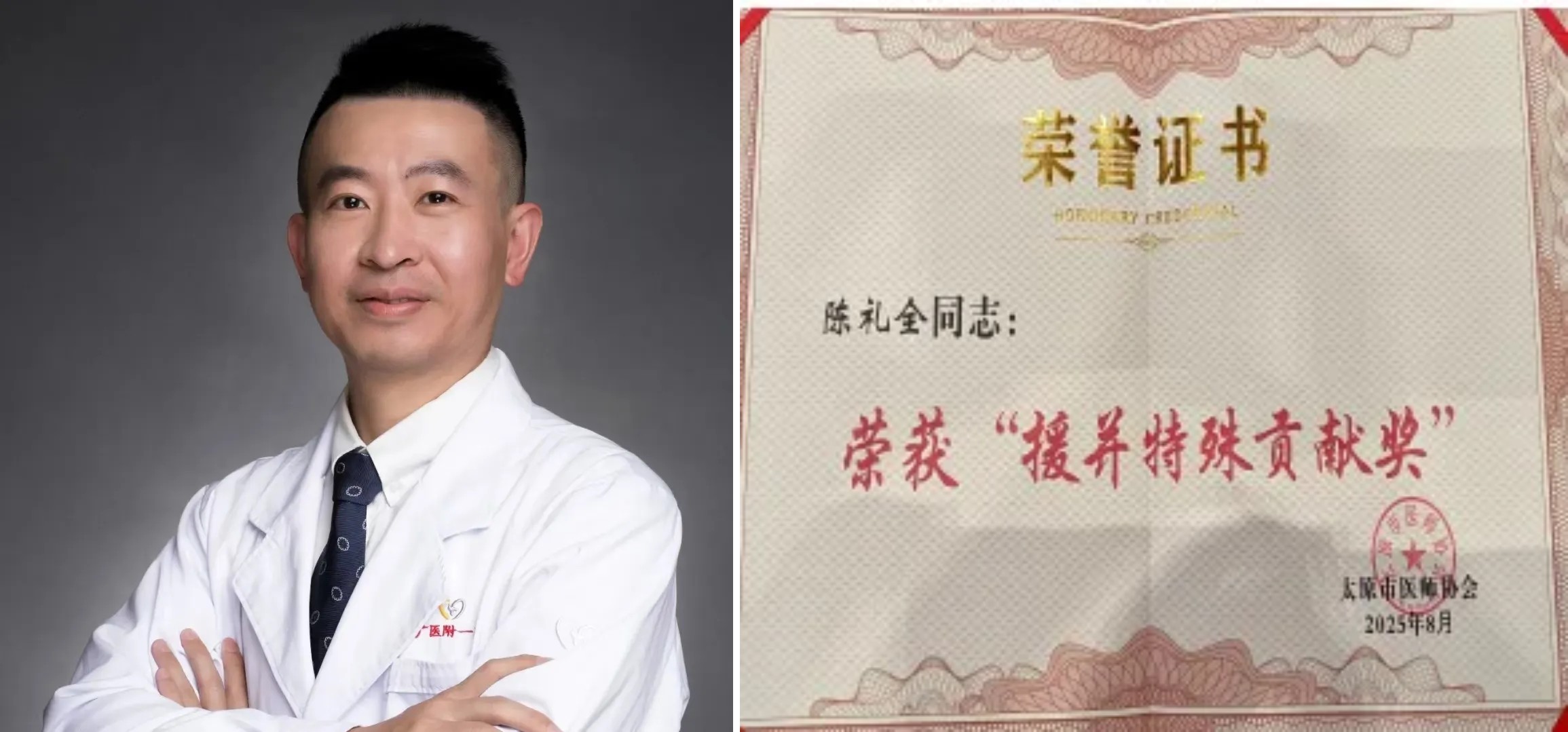 近日,山西省医院协会常务理事单位——太原市妇幼保健院外聘专家、广州医科大学附属第一医院盆底中心副主任医师陈礼全教授获得太原市医师协会颁发的“援并特殊贡献奖”。