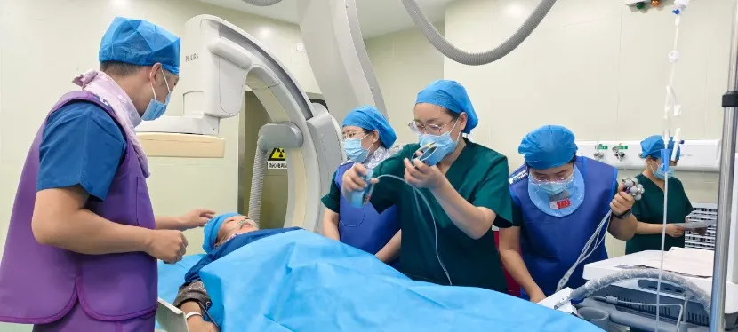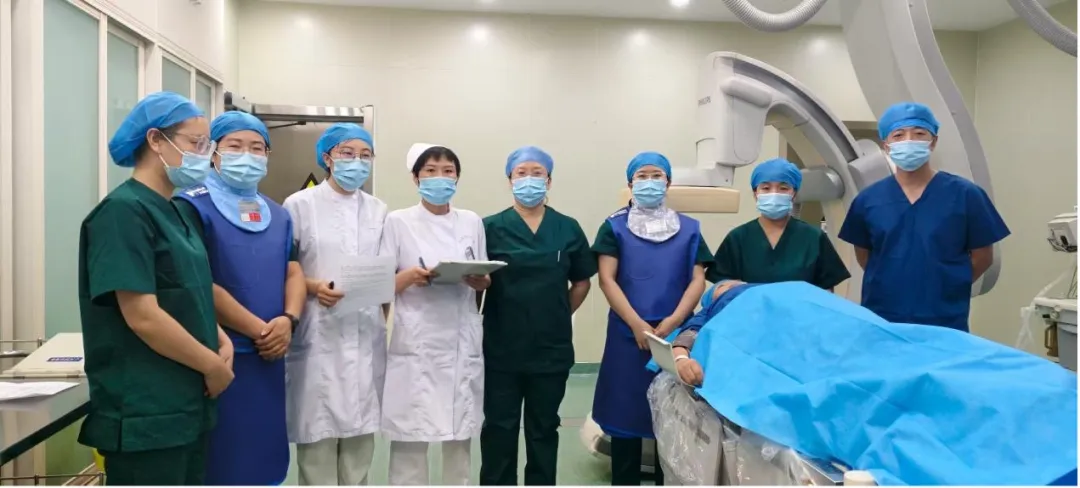 本次演练场景为:一名下肢深静脉血栓患者抵达导管室行“下腔静脉滤器置入术”时,突感胸闷、呼吸困难、烦躁不安,同时心率加快、血压下降。医护人员迅速启动应急流程:护士立即调高氧流量、垫高床头,安抚患者;遵医嘱行多巴胺药物泵入,并采集血标本。技师为患者行床旁心电图。医生同步进行病情评估,待患者生命体征平稳后,经与家属沟通,在DSA引导下,规范开展血管穿刺、造影及溶栓、碎栓治疗。