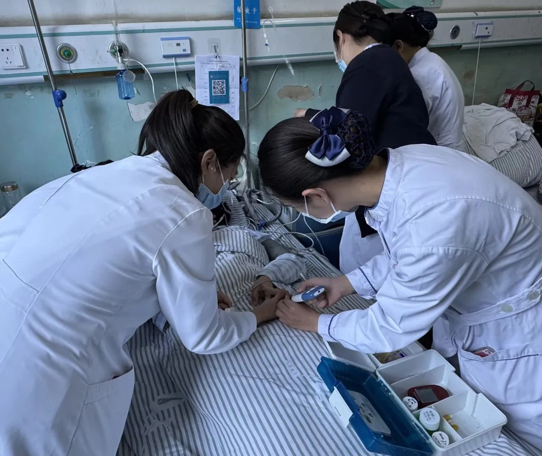 国庆节前夕,76岁的李大爷突发意识丧失、大小便失禁伴呕吐,经检测“末梢血糖低于1.0”,确诊为凶险的低血糖昏迷。潞城区人民医院肾内分泌科医护团队接诊后,立即为患者建立静脉通路,输注葡萄糖。让人意想不到的是,患者意识刚有轻微波动,更大的危机却接踵而至——入院一小时内,突发两次全身抽搐、口唇紫绀,伴呕吐褐色胃内容物,意识逐渐模糊。经检查,患者存在代谢性酸中毒、吸入性肺炎、多器官功能障碍,病情危急。