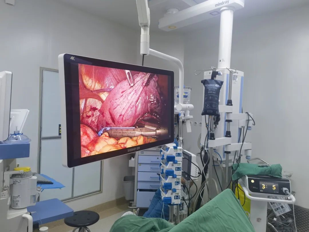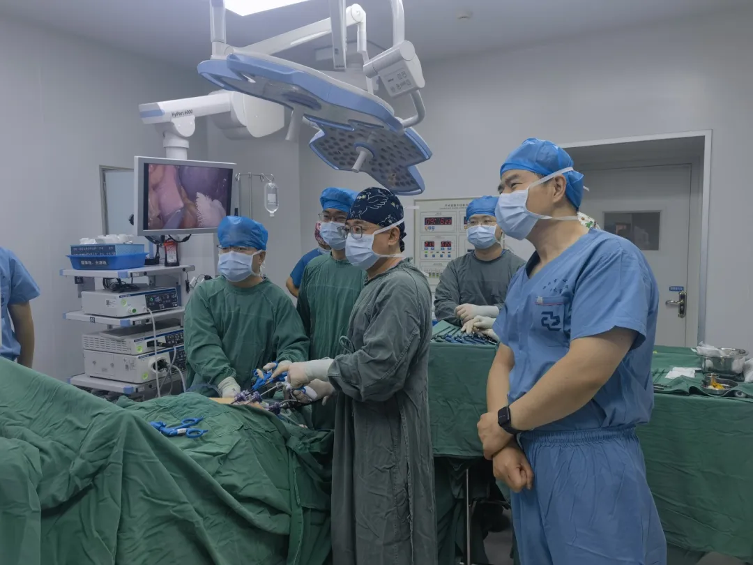手术如期进行,在陈雷教授的精心指导与悉心点拨下,肝胆外科主任李映辉及团队密切配合,在狭小的操作空间内进行着毫厘之间的精细解剖,每一次钳夹、每一道缝合,都像在纤细的血管琴弦上弹奏精准的音符,于方寸之间完成了一场关乎生死的完美乐章。随着脾上极血管的精准离断,病灶顺利切除。