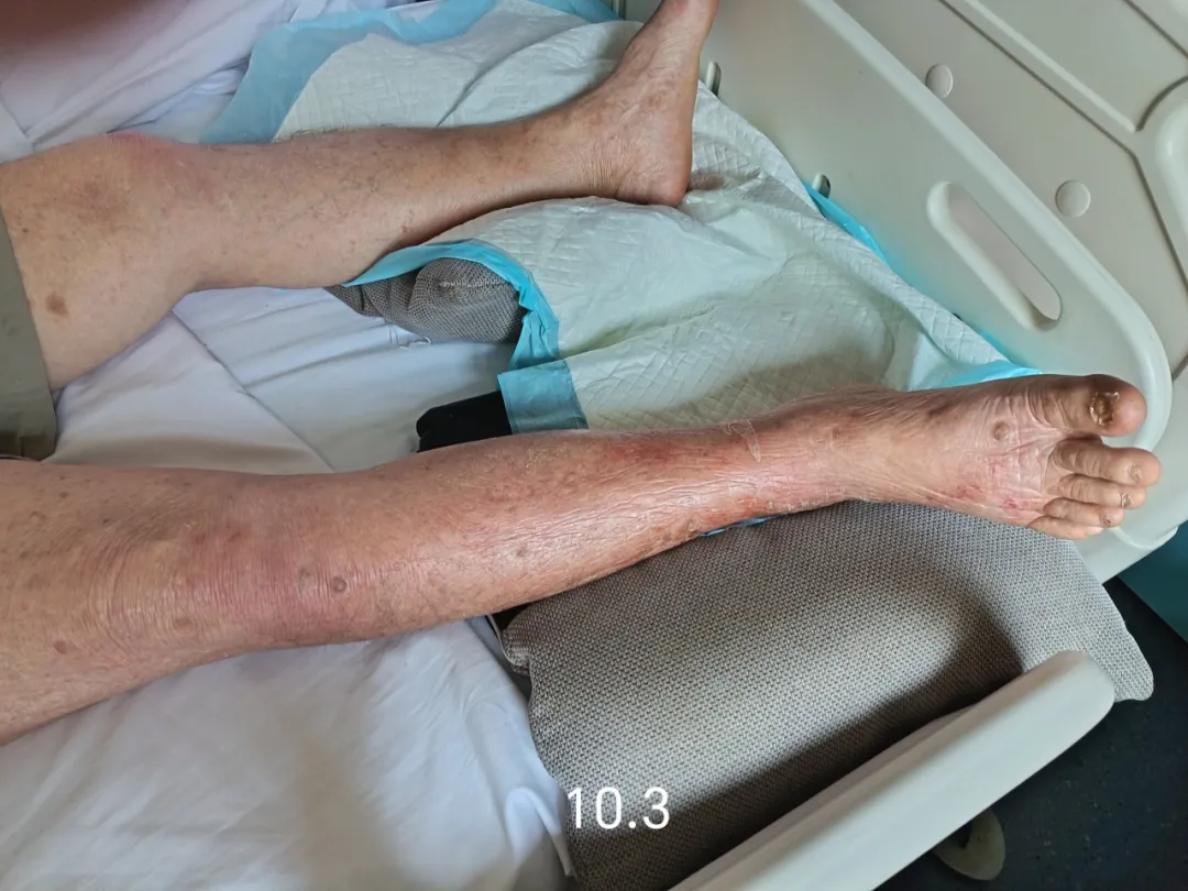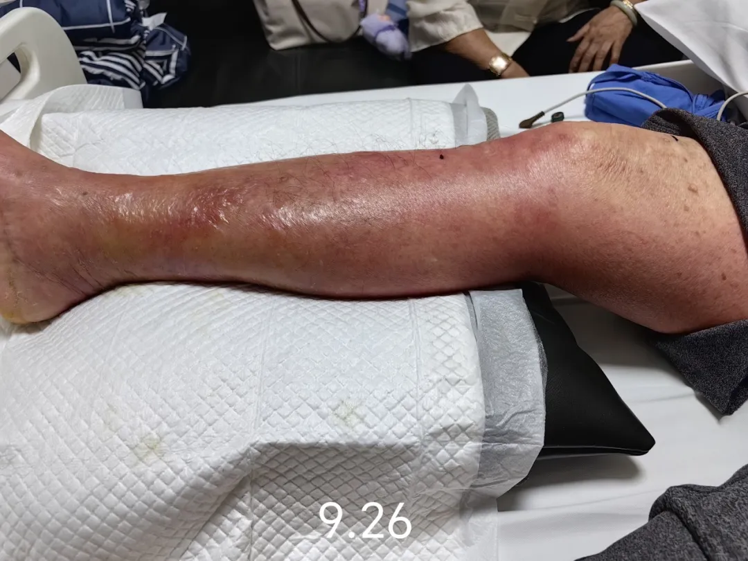 9月中旬,王先生来太原探亲期间突发高烧,右下肢迅速肿胀溃烂,感染指标超正常值数倍并伴多器官损伤。医院立即启动国际医疗绿色通道,感染科、重症医学科等7个科室组成专家团队,制定抗感染联合创面修复的综合方案。