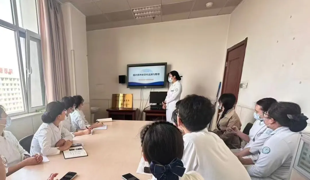 在专题授课环节,科室国家级营养支持专科护士谷越就肠内营养耐受性监测与管理进行了系统讲解,明确恶心、呕吐、腹胀、腹泻等耐受性不良症状的分级判断方法,并重点解读了“肠内营养耐受性评分量表”的使用细则,帮助学员建立标准化、同质化的评估思维。她还从营养方案优化角度出发,分享了如何根据患者耐受程度和消化功能动态调整营养制剂类型与输注速度,强调要遵循“低浓度、慢速度、循序渐进”的原则以降低耐受性风险,并介绍了包括膳食纤维补充、益生菌应用等在内的辅助干预策略。