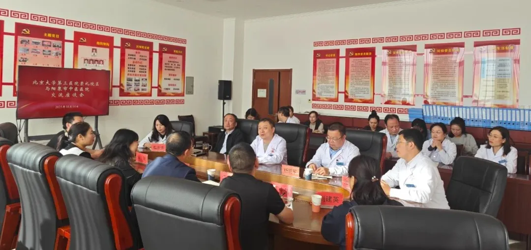 为深化跨区域医疗经验互鉴,推动优质医疗资源协同发展,10月14日,北京大学第三医院崇礼院区常务副院长江海波一行来到山西省医院协会理事单位——阳泉市中医医院参观交流。阳泉市中医医院党总支书记杜勇鑫、院长杨凯军带领领导班子及相关科室负责人参加活动。