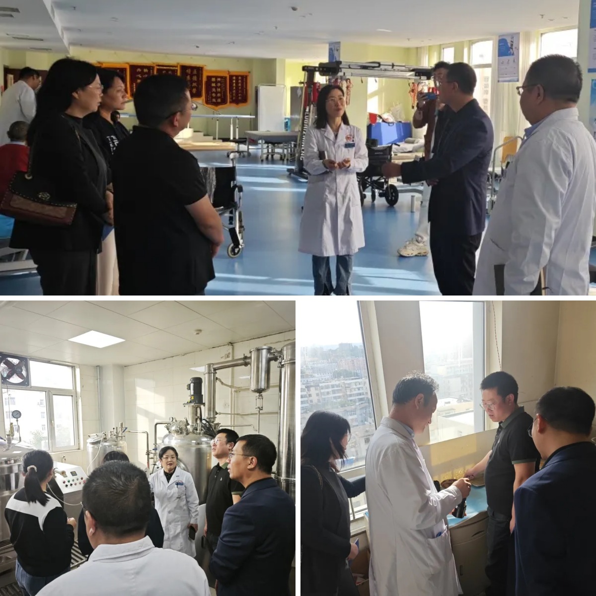 座谈结束后,江海波一行先后深入阳泉市中医医院骨外科、康复大厅、中药标本展示厅及制剂室等区域实地参观。其间,骨外科病区聚焦中医适宜技术的临床转化与应用实效,详细介绍了具体疗效与实践案例;康复大厅推广的中医适宜技术与现代康复设备的创新融合应用模式,令参观团耳目一新;中药标本展示厅以沉浸式展陈为特色,通过丰富的浸制标本、茎叶标本及中药饮片,系统呈现了中医药悠久的历史文化脉络与药材辨识知识;制剂室则全面展示了医院自主研发中药制剂的生产工艺流程、关键技术环节及质量控制体系。参观过程中,双方就中医适宜技术的临床应用展开热烈讨论。崇礼院区代表对阳泉市中医医院在中医适宜技术应用方面给予高度评价,表示将借鉴相关经验,推动自身中医能力提升。