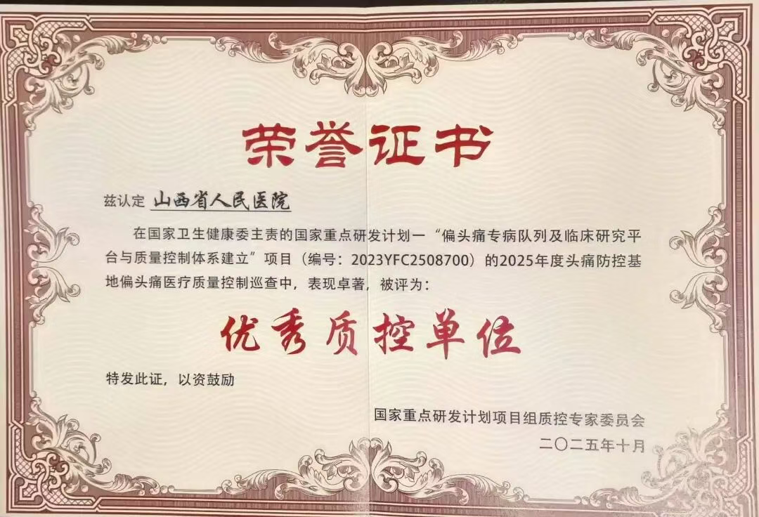 这一荣誉,是国家重点研发计划项目组质控专家委员会对医院头痛诊疗工作专业性与规范化的权威认可。山西省人民医院头痛中心自正式授牌以来,在神经内科刘毅主任的带领下,在提升诊疗水平,加强规范化管理,完善多学科协作,接受质控巡查等方面取得了一定成果,为区域内头痛患者提供了更加规范、高效的医疗服务。未来,山西省人民医院将以此次获奖为新起点,继续依托中国头痛防控体系,对标行业翘楚,深化质量建设,为推动头痛防控“质量深耕”升级、实现头痛患者规范诊疗民生目标贡献更多山西智慧与力量,在守护民众脑健康的征程中再谱新篇。