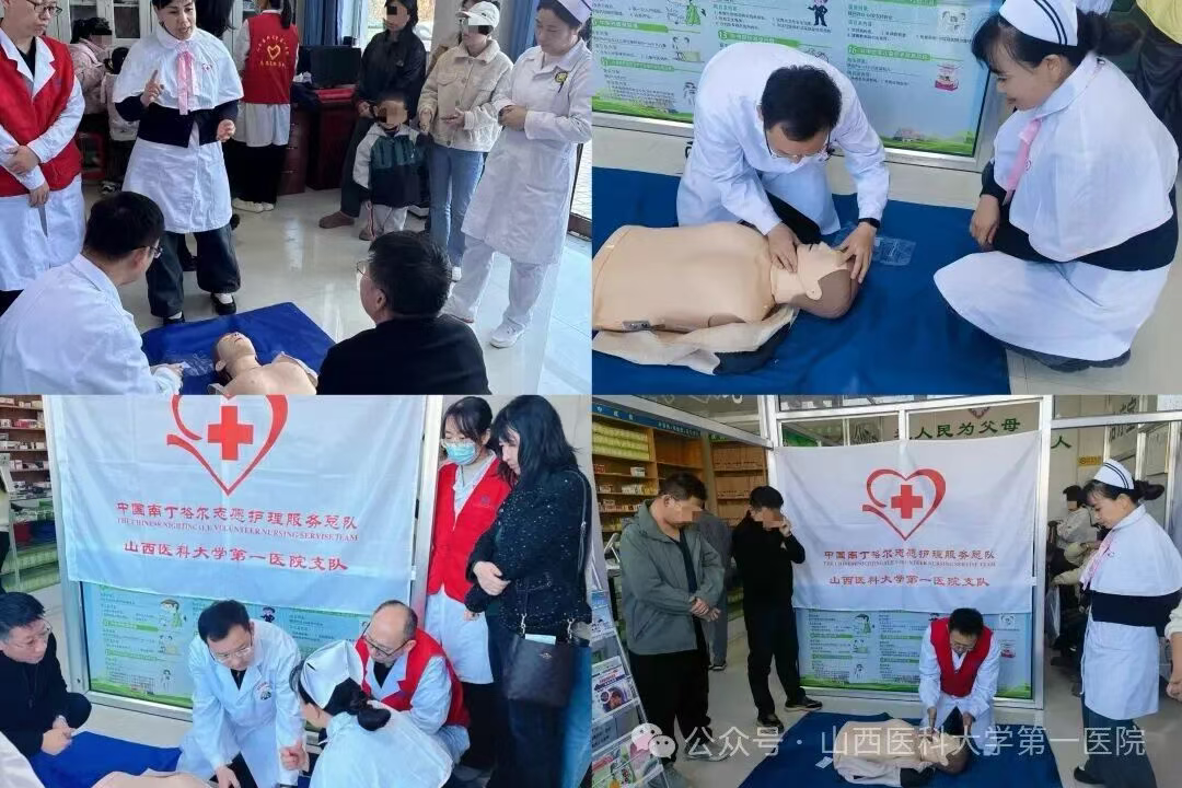 此外,专家团队还前往岚县易居苑社区开展义诊义讲活动,为前来咨询的居民提供问诊、查体、报告解读及个性化治疗建议等服务。活动现场还组织了急救技能培训,通过操作示范、关键环节讲解和现场指导练习,进一步强化基层医务人员的应急救治能力,帮助居民掌握正确的急救操作要领,筑牢基层健康防线。本次活动共惠及群众150余人,受到广泛好评。