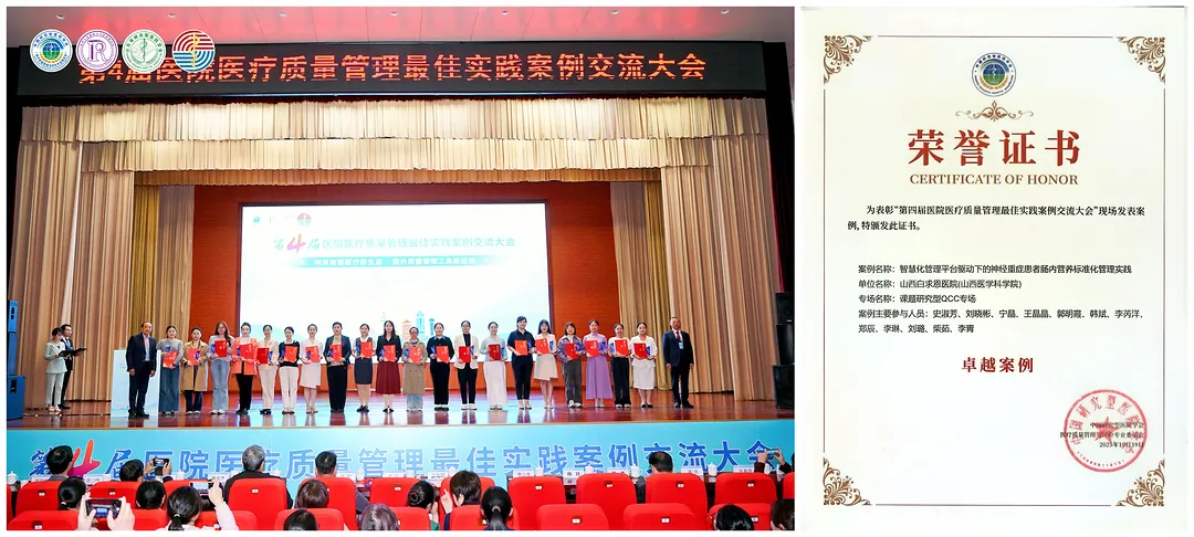 在课题研究型QCC专场,神经外科二病区护理团队的参赛案例《智慧化管理平台驱动下的神经重症患者肠内营养标准化管理实践》,荣获卓越案例奖。该案例针对神经重症患者肠内营养管理中营养不良发生率高、喂养不耐受等痛点问题,以多学科协作团队为支撑,构建了神经重症患者“筛—评—诊—治—监”五位一体的标准化管理体系,推动管理模式从“经验驱动”向“数据驱动”转型。