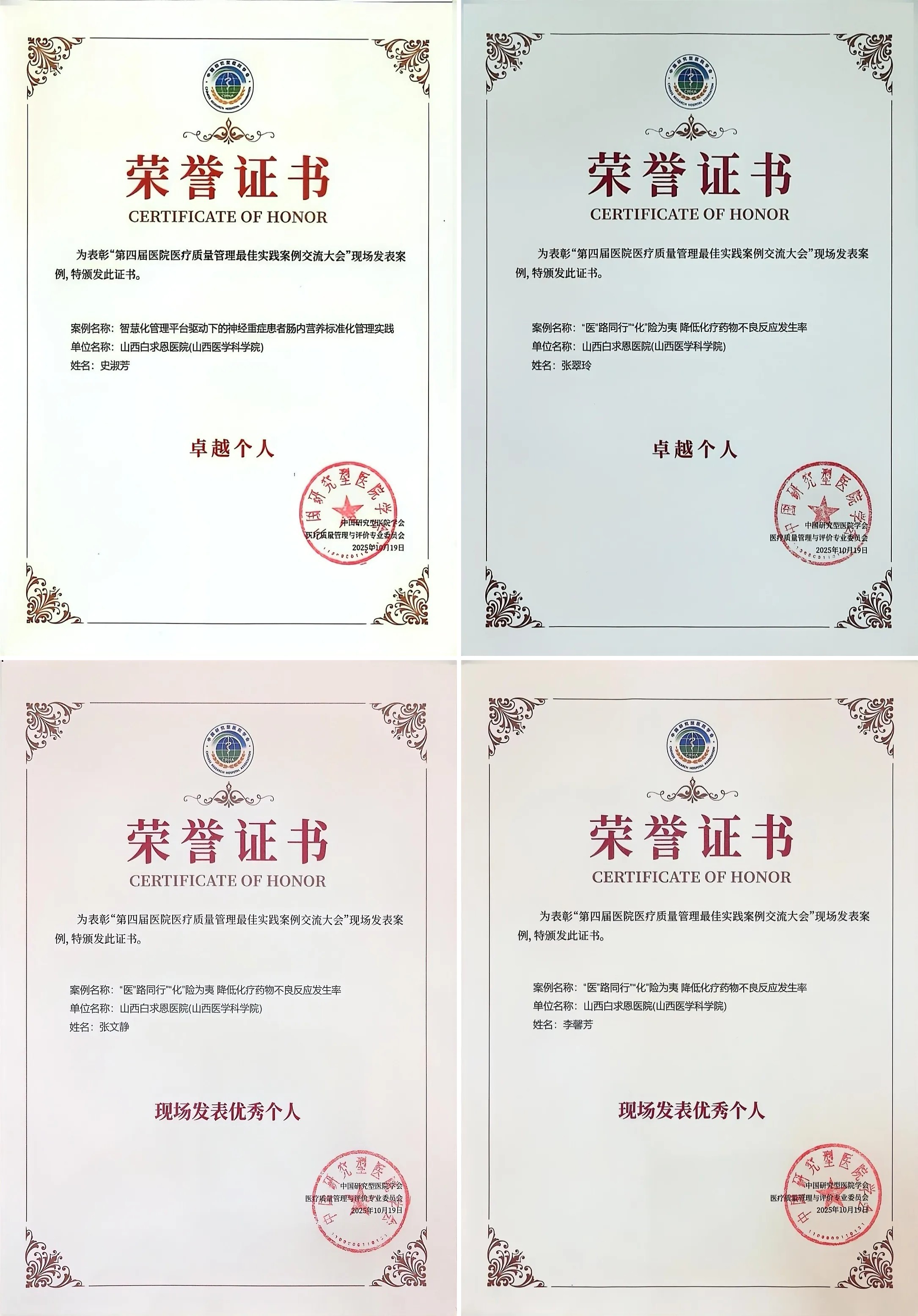 同时,外科系统史淑芳总护士长、消化系统肿瘤科张翠玲护士长分别荣获卓越个人奖;消化系统肿瘤科张文静主管护师、李馨芳护师荣获现场发表优秀个人奖。