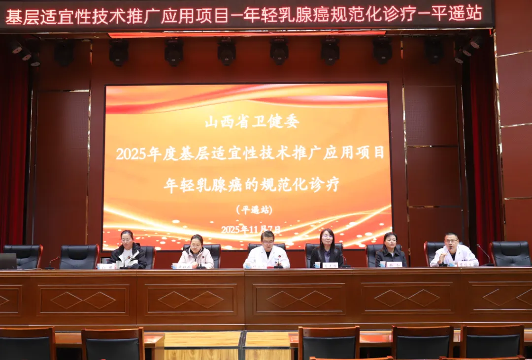 2025年11月7日,山西省基层适宜性技术推广应用项目“年轻乳腺癌的规范化诊疗”平遥站活动在山西省医院协会理事单位——平遥县人民医院举行。山西省人民医院乳腺科杨璇主任医师专家团队通过专题学术讲座与惠民义诊相结合的形式,为当地乳腺疾病诊疗注入新的动能。平遥县及周边地区医疗同仁参会交流。