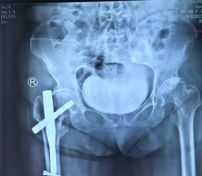 患者,女性,74岁,因先天性髋关节发育不良导致股骨头坏死多年,既往有多年的强脊炎病史,饱受腰痛及髋部疼痛煎熬,平素行走举步维艰,髋关节伸屈活动范围仅仅40º。本次因行走不便摔伤致股骨转子间骨折。