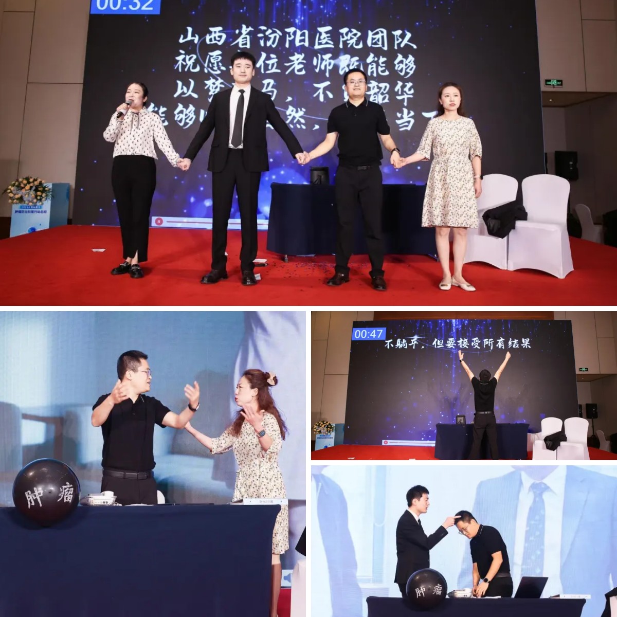 参赛作品由任耀强副主任医师、奥泽宏医师、田蕾主管护师及泌尿外科手术护理组组长杨莹创作,采用默剧演绎为主,视频辅助与旁白引导相结合的形式,以“情绪内耗与肿瘤的关联性”为核心切入点,构建了一段触动人心的生命叙事:主角从青春洋溢的美好状态出发,在生活与工作的双重压力下陷入情绪内耗的困境,而象征肿瘤的黑色气球则随负面情绪累积逐渐膨胀;随后,主角学会直面内心、拥抱积极情绪,最终冲破情绪牢笼,刺破“肿瘤气球”,迎来新生。独特的艺术呈现与深刻的健康寓意,赢得了现场专家评委的一致好评。