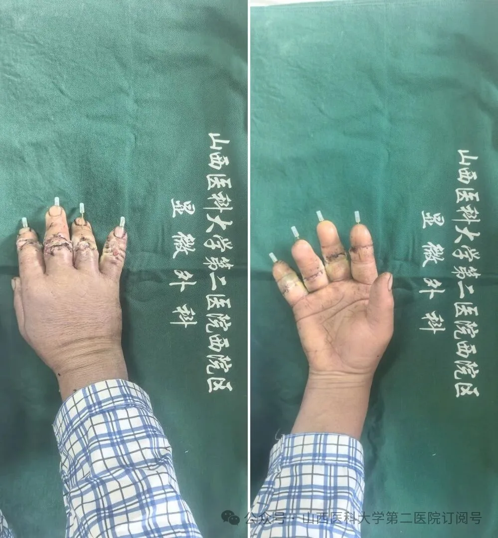 为保障手术质量,科室安排两组医护人员轮流上台接力。时间一分一秒流逝,汗水浸透手术衣,直至最后一根手指恢复血运、变得红润温暖,手术室内的所有人终于长舒一口气——历时8小时,四指再植手术宣告成功。此时,高星、白丽兵已连续工作32小时,他们用坚守诠释了医者使命。