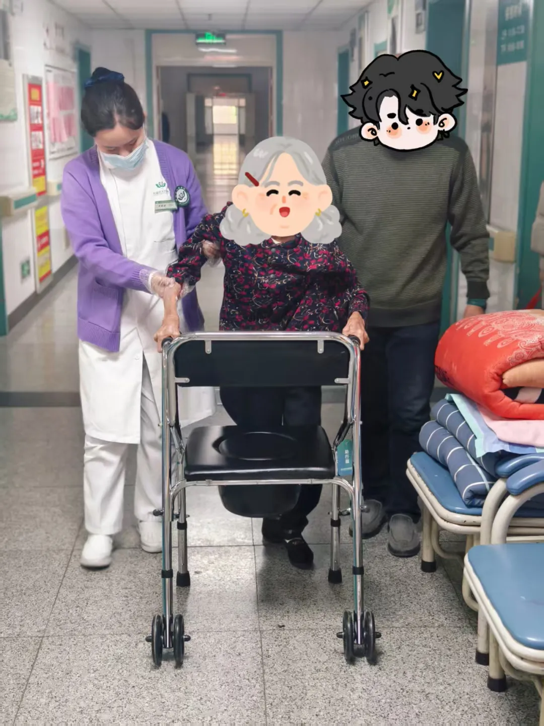 手术当天,在麻醉团队的密切监护与配合下,骨科主任解季凯担任主刀,顺利为患者完成人工股骨头置换。术后,护理团队依据“加速康复外科(ERAS)”理念,实施个体化康复计划,涵盖疼痛管理、营养支持及早期功能锻炼等方面。术后第三天,患者在医护人员及家属的鼓励和协助下,借助助行器实现站立,并迈出术后第一步。患者脸上重现笑容,家属对治疗效果表示满意,并向科室医护人员表达了感谢。