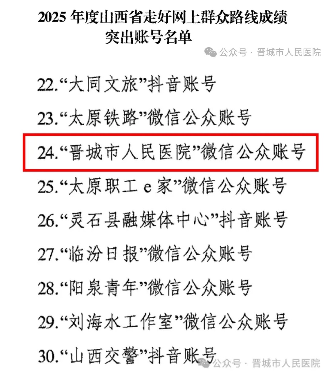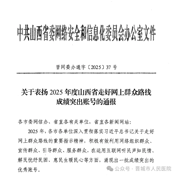 12月3日,山西省医院协会常务理事单位——晋城市人民医院发布消息,该院主办的“晋城市人民医院”微信公众号,在中共山西省委网络安全和信息化委员会办公室举办的“2025年度山西省走好网上群众路线成绩突出账号”评选活动中获奖,成为全省唯一获此殊荣的医疗类新媒体账号。