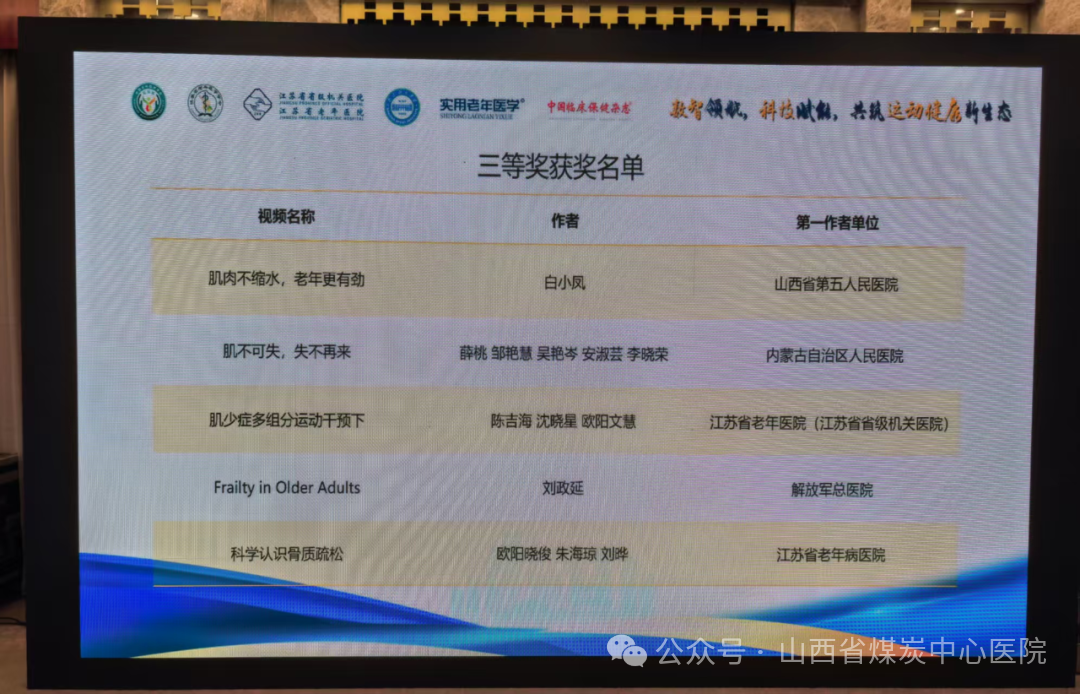 会议同期举办的“运动健康 体卫融合”科研论文摘要及科普视频征集竞赛中,该院老年医学中心内分泌科护士白小凤的科普视频作品《肌肉不缩水,老年更有劲》凭借新颖的视角、通俗易懂的表达以及贴近老年人需求的内容设计,荣获三等奖,充分展现了该院医护人员在健康科普领域的积极探索与扎实能力。