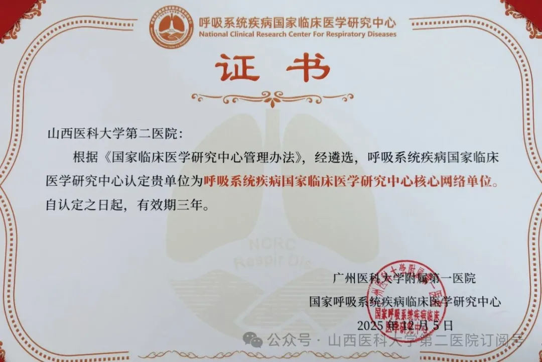 近日,呼吸系统疾病国家临床医学研究中心认定山西省医院协会副会长单位——山西医科大学第二医院为该中心核心网络单位。这一认定是国家层面对山西医科大学第二医院呼吸学科综合实力的权威认证,标志着该院正式跻身国家级呼吸疾病研究与防治的核心协作体系,成为全国呼吸领域优质医疗资源联动网络中的重要一员。