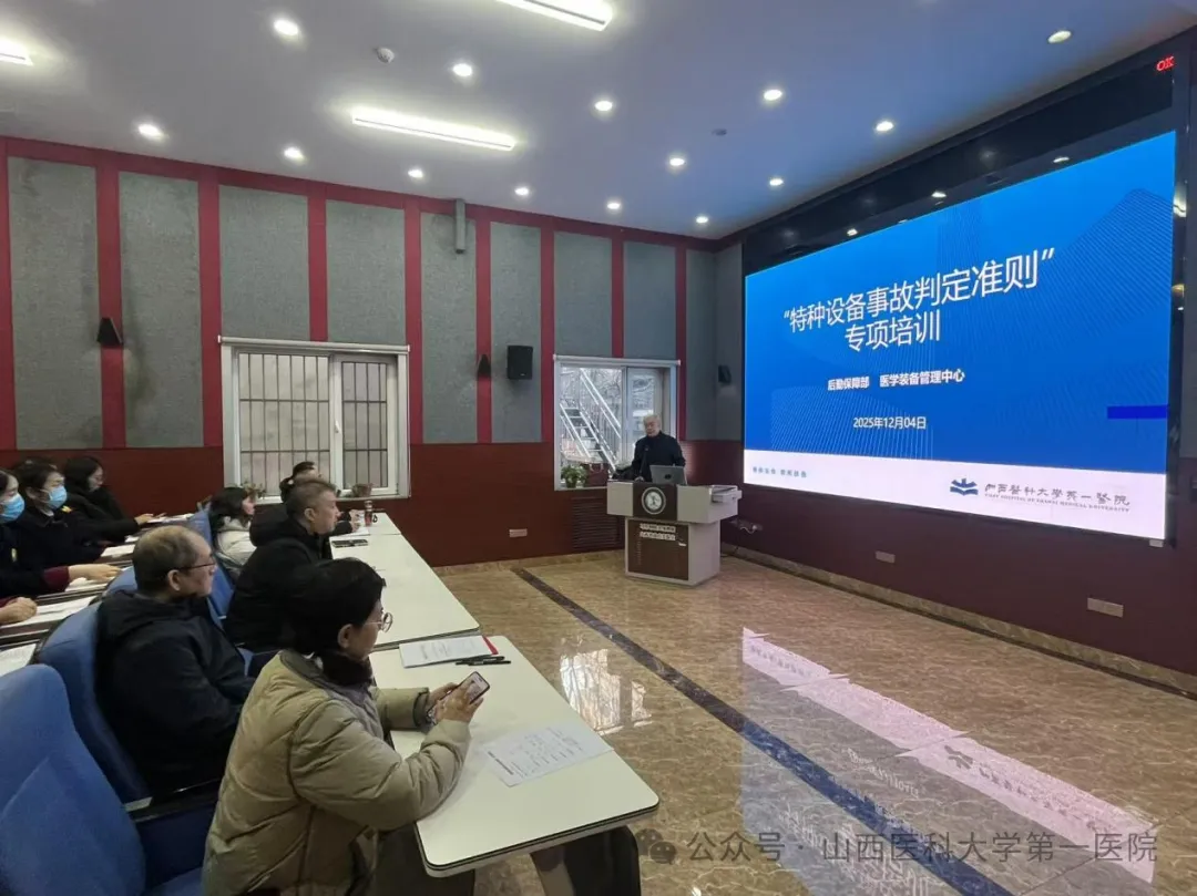 特种设备是医院诊疗服务的“生命线”,电梯的平稳运行、氧气瓶的安全供给、高压灭菌器的规范操作,直接关系到患者的生命健康与医护人员的作业安全。为切实强化特种设备安全管理能力,规范事故处置流程,12月4日,山西省医院协会副会长单位——山西医科大学第一医院后勤保障部组织的特种设备安全专项培训在护校耳鼻咽-头颈外科喉科重点实验室会议室举行,全院从事特种设备及特殊作业管理、操作(含外包外委)等相关岗位的40余名人员参加。山医大一院副院长姜增誉主持。