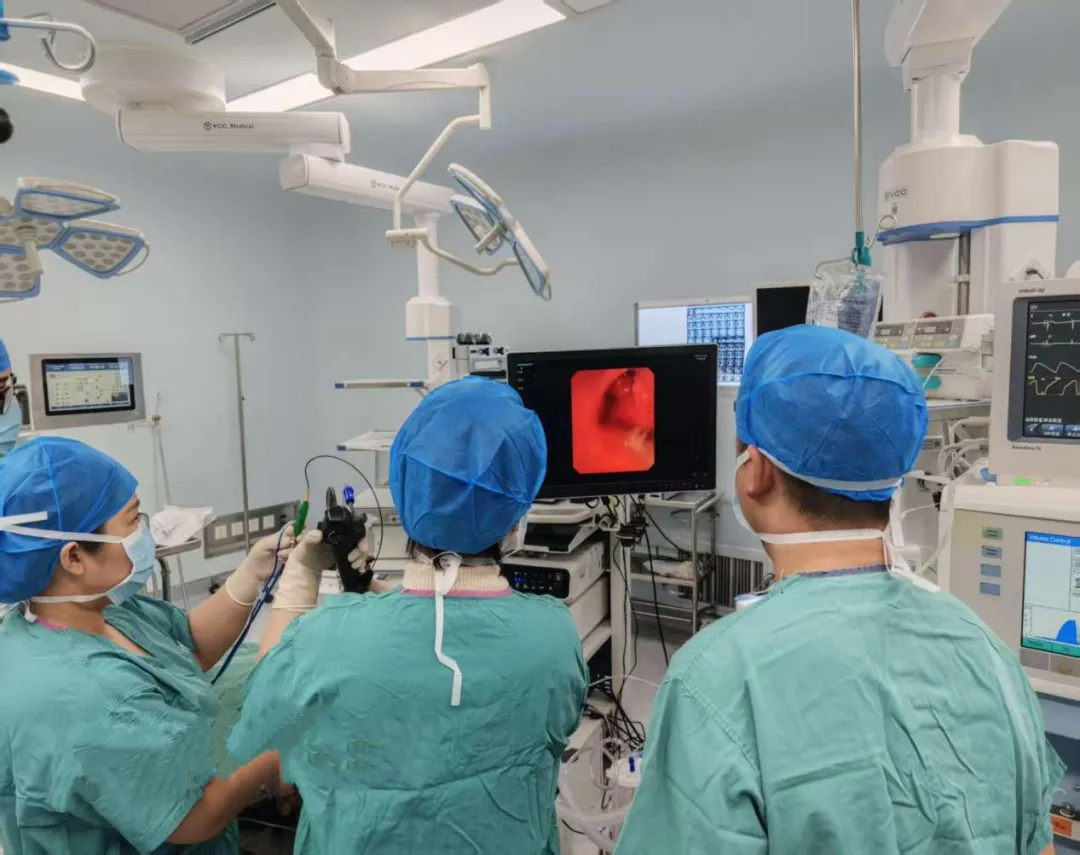 面对高龄、危重、气道阻塞复杂的棘手病例,以王俊平主任为核心的医疗团队迅速集结,联合麻醉科制定周密手术方案。王艳艳主任医师、冯曙光主治医师、王江顺住院医师及史盼盼护师组成的操作团队,在麻醉科全程护航下,精准将支气管镜探入险象环生的气道。