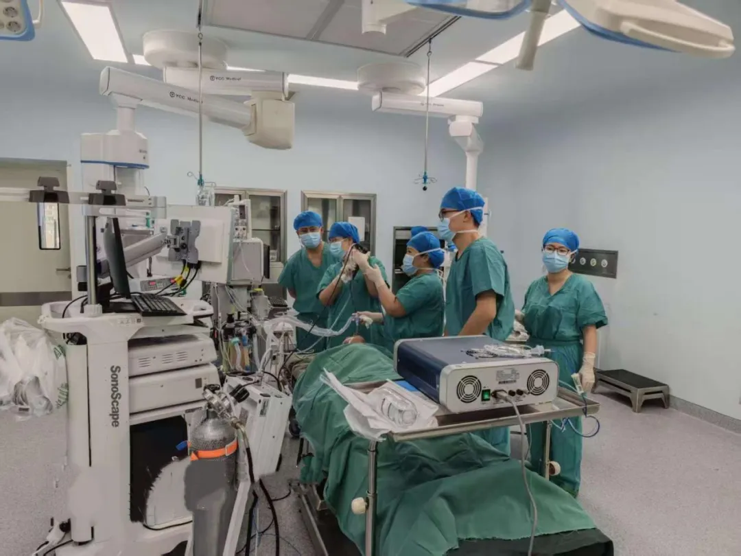 先用微波消融技术精准“烧灼”肿瘤基底,再以冷冻技术将坏死组织“连根清除”,医疗团队一步步清理病灶、扩张气道。面对术中突发的出血风险,大家沉着应对、精准止血,最终成功打通右主支气管,让右肺恢复通气功能。虽左主支气管因完全闭锁未能开通,但已显著缓解患者呼吸窘迫,为后续治疗抢占了宝贵时间。