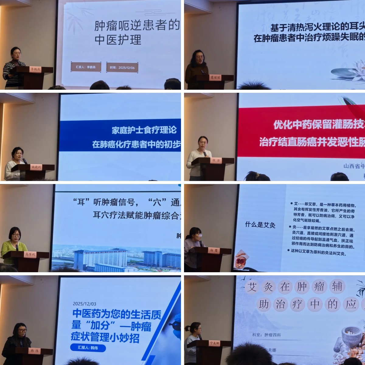 学术分享环节,多位专家登台介绍前沿学术成果,为参会者奉上全方位、深层次的学术盛宴。王志婕深度剖析针刺及相关穴位刺激疗法抗肿瘤及相关症状的临床疗效与安全性,为物理疗法在肿瘤领域的规范化应用筑牢循证根基。李晓丽系统梳理白蛋白紫杉醇的作用机制及中西医研究进展,搭建起中西医药物研究的互通桥梁。薛瑞深挖附子在恶性肿瘤中的应用奥义,解锁经典中药的抗肿瘤潜能。薛美平聚焦肿瘤厌食-恶液质综合征,分享中西医结合治疗的独特方案。李娟详解穴位埋线治疗肺癌相关症状的实践经验,拓展肿瘤特色疗法的应用边界。张志鹏带来经方治疗恶性肿瘤的应用与探索,传承经典医方的诊疗智慧。李志辉阐释毫火针在肿瘤科的临床应用,展现中医特色技术的独特优势。杨晞提出调和情志辅助癌症患者康复的理念,完善肿瘤全周期诊疗体系。赵珊珊、王洁分别就咳嗽、卵巢癌的中医治疗展开专题解读。王利民结合自身实践,分享肿瘤中医治疗的宝贵心得。