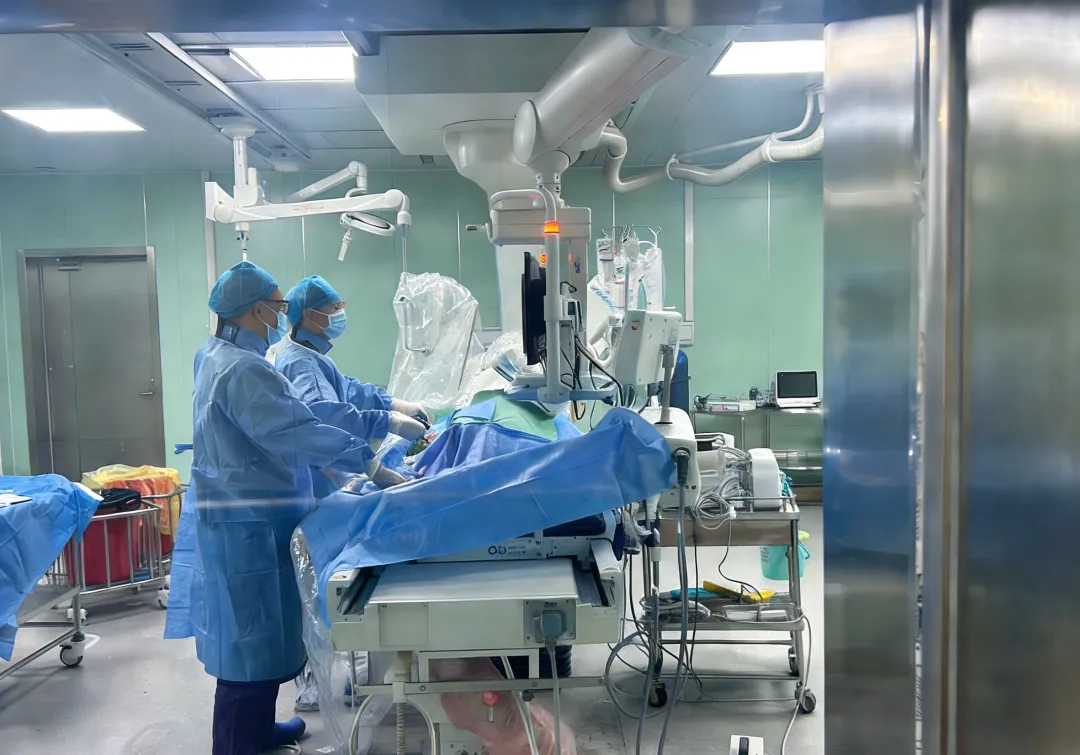 当天20时左右,61岁的张先生因“胸憋、胸痛1小时”来到乡宁县人民医院急诊,心电图提示急性下壁心肌梗死并伴随心源性休克,病情危急。“必须立即开通堵塞血管,否则心肌坏死将不可逆!”杜玉宁当机立断,团队即刻投入第二台手术。冠脉造影显示患者右冠状动脉近段100%闭塞。紧急开通并植入1枚支架后,患者病情趋于平稳,顺利转入CCU病房接受后续治疗。