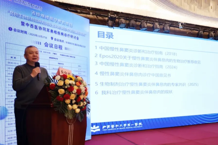 2025年12月27日,由山西省医院协会副会长单位——长治医学院附属和平医院耳鼻咽喉科主办的省级继续教育项目——鼻用生物制剂临床应用及鼻科疾病诊疗新进展培训班暨中西医协同耳鼻喉疾病诊疗研讨会成功举办。来自省内外多家医疗机构的耳鼻咽喉科专家、学者及临床骨干齐聚一堂,共同探讨鼻科疾病诊疗的前沿进展与中西医协同治疗实践。长治医学院附属和平医院副院长郭伟、山西省医师协会耳鼻喉医师分会会长柴向斌出席并致辞。长治医学院附属和平医院耳鼻咽喉科主任常玮主持开幕式。