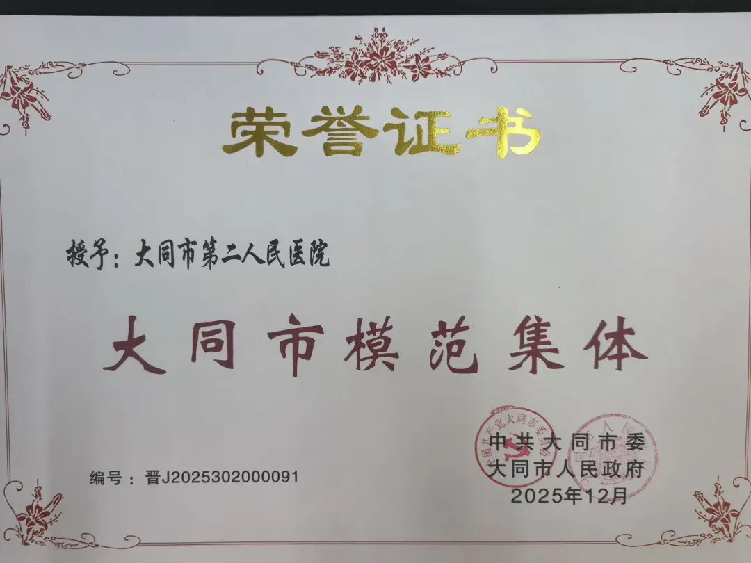 荣誉催人奋进,使命呼唤担当。大同市第二人民医院表示,将一如既往恪守“敬佑生命、救死扶伤、甘于奉献、大爱无疆”的职业精神,以更高标准强化医疗质量管控,以更优服务践行医者为民初心,以更强担当投身实干事业。并将充分发挥模范带头作用,为大同市“三城三地”建设贡献医疗力量;持续提升医疗服务能力与核心竞争力,全力保障大同及周边区域群众身体健康。(王宏霞 邢鹏 王静)