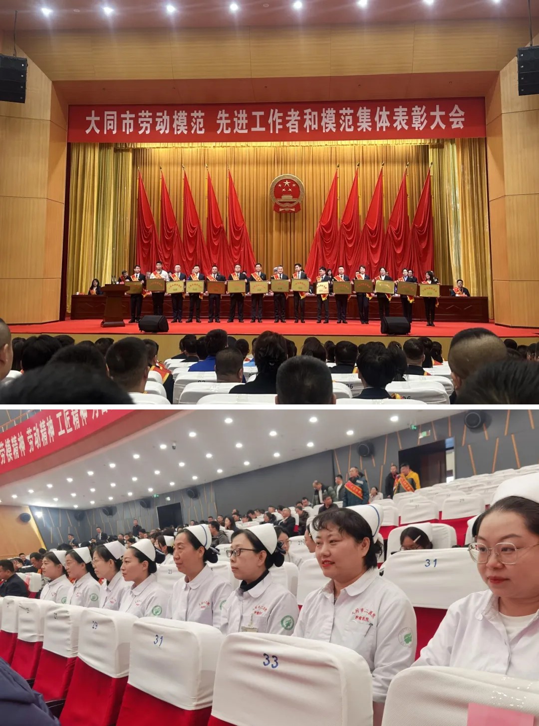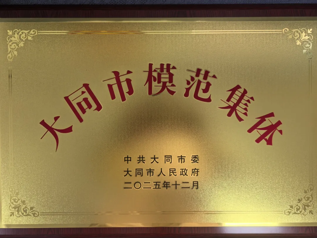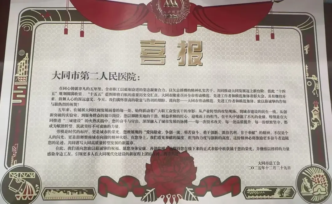 2025年12月29日,山西省医院协会常务理事单位——大同市第二人民医院在大同市劳动模范、先进工作者和模范集体表彰大会上获颁“大同市模范集体”荣誉证书及牌匾。