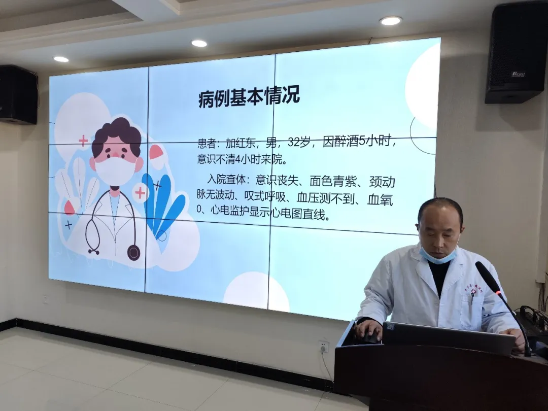 急诊科团队分享了一例多急症叠加的抢救成功典型病例。该病例患者因酒精中毒引发异物吸入窒息,继而出现心脏停搏,病情危急、瞬息万变。急诊科医护团队迅速启动急救预案,开展气道清理、气管插管、胸外心脏按压、心电监护、药物复苏等一系列急救措施,成功挽回患者生命。会上,各临床科主任对整个抢救流程进行复盘,梳理了酒精中毒合并气道梗阻、心搏骤停的急救要点与处置规范,为全院急诊急救能力提升提供了鲜活的实践范本。