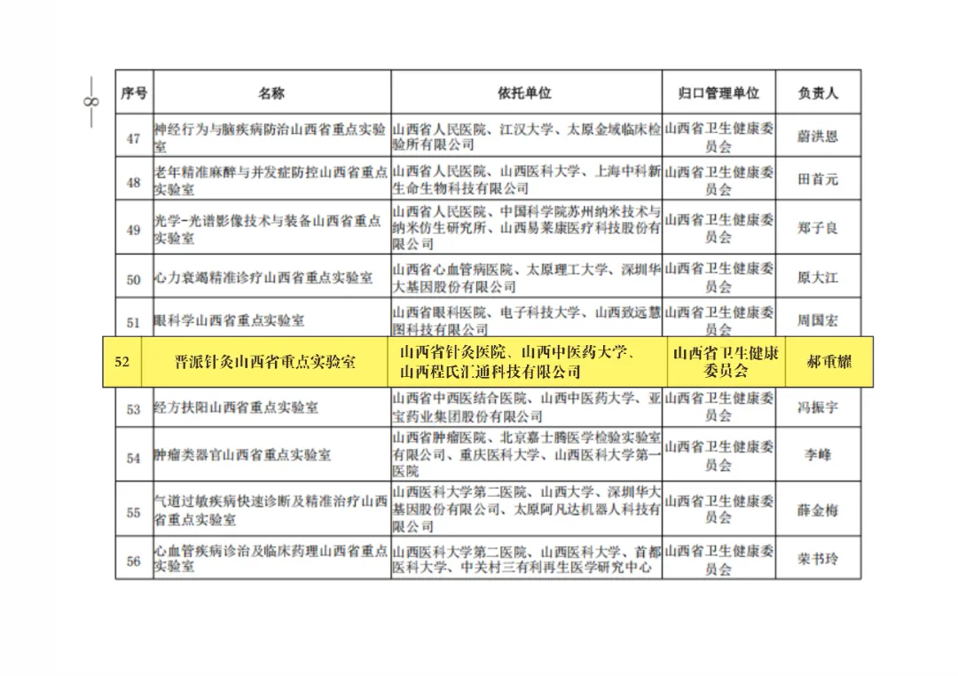 该实验室由山西省针灸医院、山西中医药大学、山西程氏汇通科技有限公司三方共建,将整合三方临床资源、科研优势与团队力量,搭建高水平科研协作平台。实验室将聚焦晋派针灸领域共性关键技术攻关,加速科技成果转化应用,破解临床诊疗核心难题,为患者提供更优质、更精准的医疗服务。