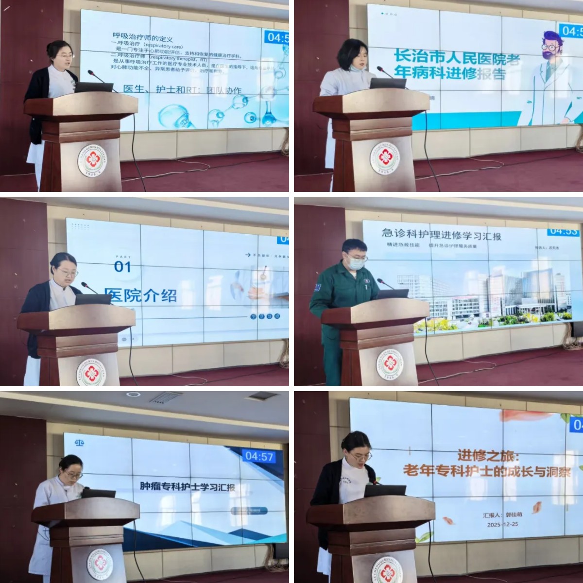 会上,6名进修护士依次进行汇报,结合自身进修经历,从护理技术、护理创新、总结与反思等方面分享学习成果。同时,她们将所学先进理念与技术同科室护理现状相结合,指出科室现阶段发展中有待提升和改进的方向,为科室护理工作优化提供了新思路。
