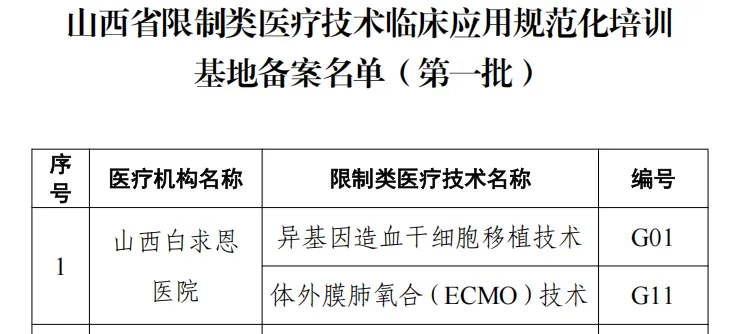 近日,山西省卫生健康委员会公布全省第一批限制类医疗技术临床应用规范化培训基地名单。山西省医院协会副会长单位——山西白求恩医院血液内科开展的“异基因造血干细胞移植技术”(编号G01)经严格评审,成功入选。