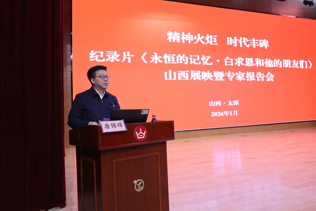 唐锦辉在讲话中指出,山西是白求恩精神的重要发源地与实践地,这片土地上的红色记忆,是白求恩精神丰碑的重要基石。作为以“白求恩”命名的医院,山西白求恩医院自诞生起便深植白求恩精神基因,2019年与华中科技大学同济医学院附属同济医院共建国家区域医疗中心以来,医院始终将“对工作极端负责、对同志对人民极端热忱、对技术精益求精”的白求恩精神融入党建、医疗、教学、科研、管理等各个环节,荣获“全国文明单位”“全国公立医院党建示范医院”等多项荣誉。他表示,承办此次活动是一次深刻的精神洗礼,期待以光影为媒汇聚各方力量,推动白求恩精神研究与传承再上新台阶。