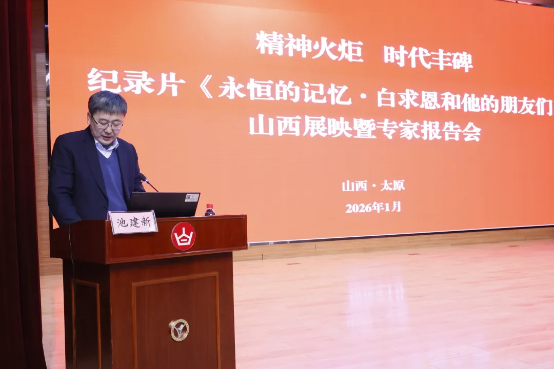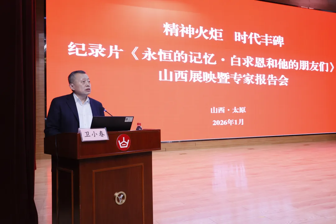 1月16日,纪录片《永恒的记忆・白求恩和他的朋友们》山西展映暨专家报告会在山西省医院协会副会长单位——山西白求恩医院 同济山西医院举行。山西省医学会会长、第十四届全国人大常委会委员卫小春,山西省卫生健康委党组成员、副主任舒言,山西白求恩医院党委书记唐锦辉,中央新闻纪录电影制片厂(集团)副总经理、中央新影发现纪实传媒董事长池建新出席活动并讲话。山西省医学会白求恩精神研究专家委员会副主委柴志凯主持。