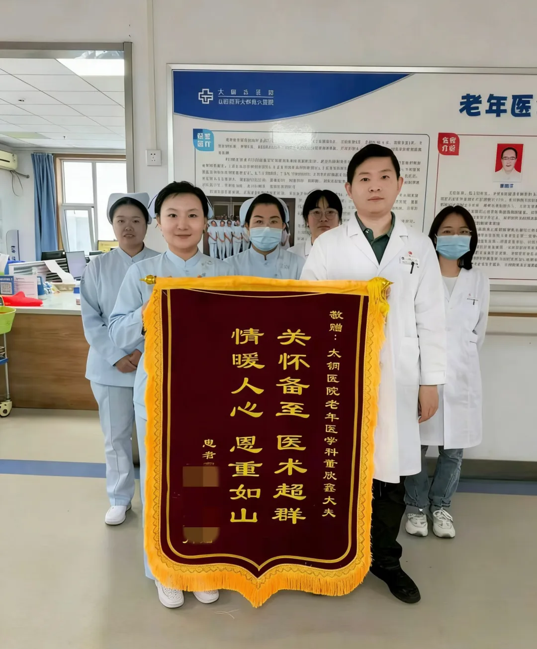 确诊后,董欣鑫第一时间协调床位,为老人启动紧急住院治疗,制定了利尿、控制心率的系统方案。住院的日子里,董欣鑫的关怀从未缺席:每一次查房,他都会俯身细致讲解病情,耐心叮嘱用药细节;每一回调整治疗方案,都反复与老人沟通,缓解焦虑。护理团队也始终贴心相伴,从定时监测生命体征、精准调整用药,到帮老人端水喂饭、疏导负面情绪,事事尽心尽力。数日后,老人的水肿渐渐消退,呼吸也恢复顺畅,病情终于稳定下来。